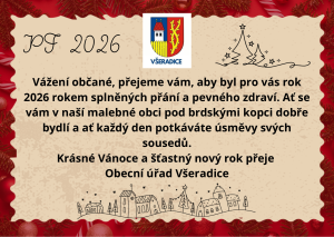 Obecní úřad Všeradice srdečně přeje všem občanům krásné Vánoce a šťastný nový rok 2026. Ať je tento rok naplněn splněnými přáními a pevným zdravím pro všechny.