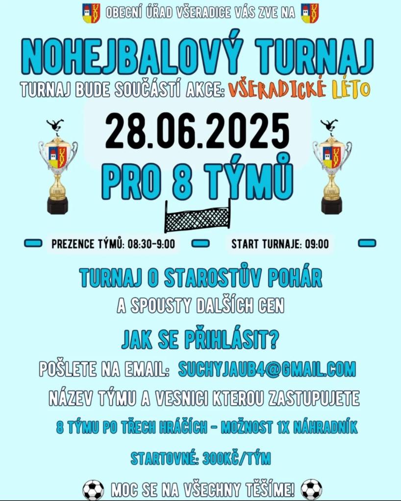 Všeradice pořádají Nohejbalový turnaj, který se koná v rámci akce Všeradické léto. Přihlašování je možné pro týmy o třech hráčích s možností jednoho náhradníka. Startovné činí 300 Kč za tým a pro více informací se obraťte na uvedený e-mail.
