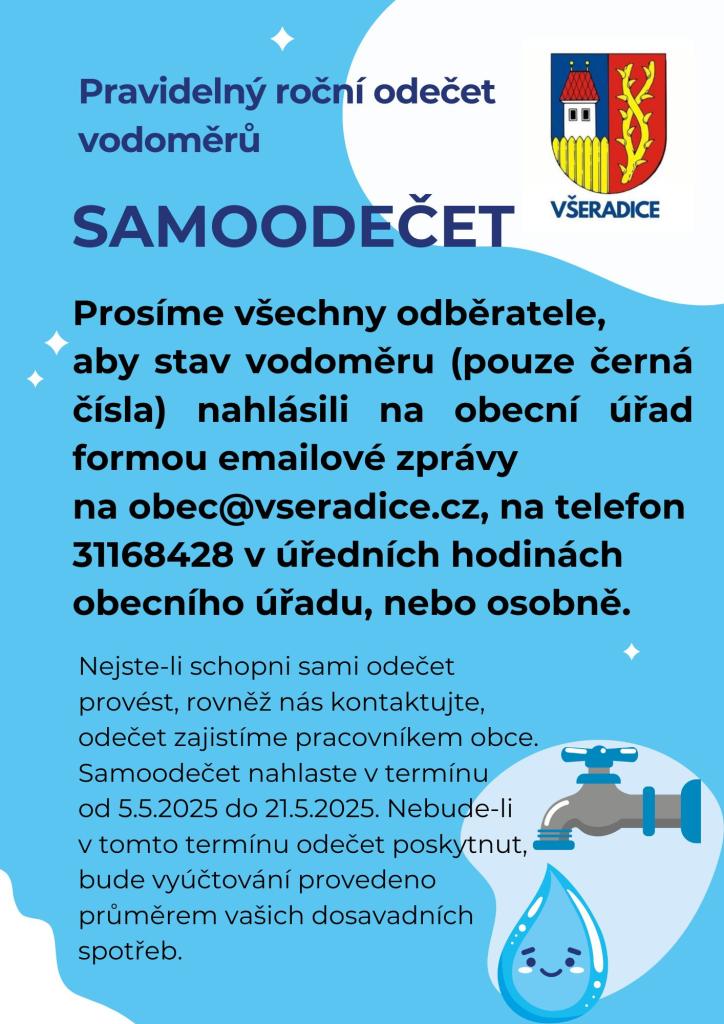 Obecní úřad žádá všechny odběratele, aby v období od 5. do 21. května 2025 nahlásili stav svých vodoměrů, a to pouze černá čísla. Stav je možné nahlásit prostřednictvím e-mailu, telefonicky nebo osobně v úředních hodinách. Pokud nemáte možnost sami stav odečíst, pracovníci obce vám s tím rádi pomohou. Je důležité nahlásit odečet v uvedeném termínu, jinak bude vyúčtování provedeno průměrem vašich dosavadních spotřeb.