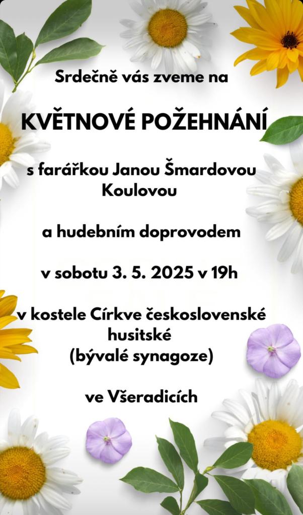 Srdečně vás zveme na nové požehnání, které se bude konat v sobotu 3. května 2025 od 19 hodin. Akce se uskuteční v kostele Církve československé husitské, bývalé synagoze ve Všeradicích. Vedení akce se ujme farářka Jana Šmardová Koulová a můžete se těšit na hudební doprovod, který obohatí tento slavnostní okamžik.