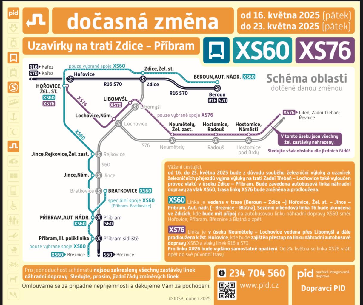 dovolte mi, abych Vás tímto informovala, že v termínu 16. 5. – 23. 5. 2025 proběhne výluka na železniční trati 200 v úseku Zdice – Příbram. V souběhu s tím proběhnou uzavírky železničních přejezdů a bude též pokračovat železniční výluka na trati 172 v úseku Liteň – Lochovice.