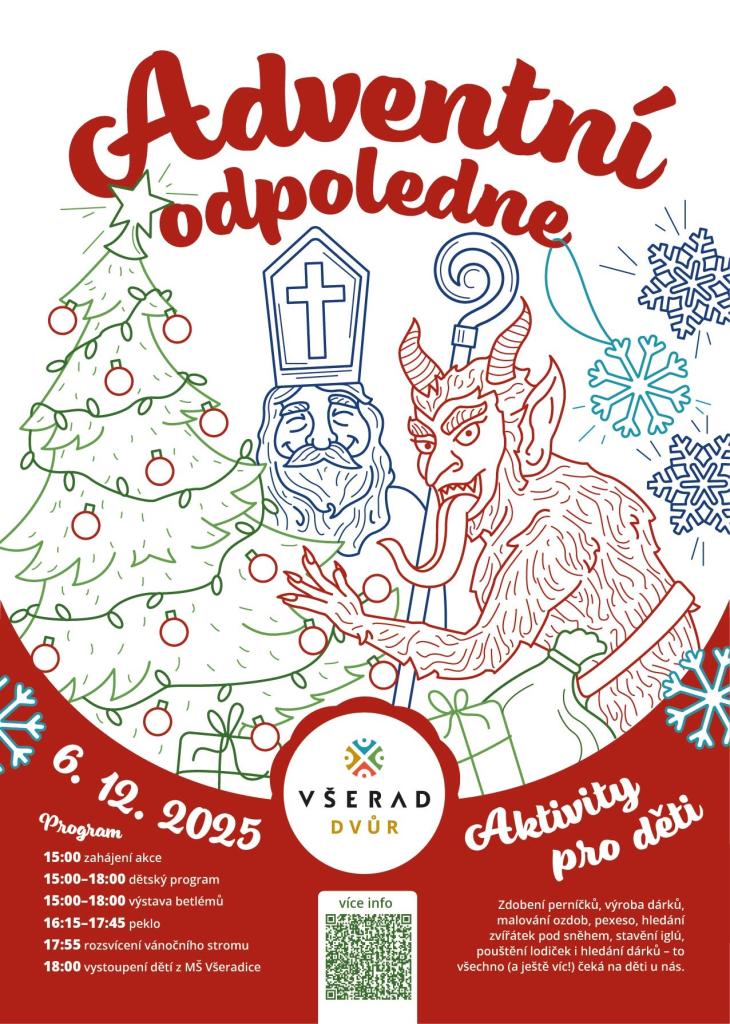 Zveme vás na vánoční akci, která se koná 15. prosince 2025 od 15:00 do 18:00. Připraven je pestrý program, včetně výstavy betlémů, rozsvícení vánočního stromu a vystoupení dětí z MŠ Všeradice. Pro mladé návštěvníky budou k dispozici různé aktivity, jako je zdobení perníčků, výroba dárků, malování ozdob či hledání zvířátek pod sněhem. Přijďte si užít předvánoční atmosféru a strávit příjemné odpoledne s rodinou.