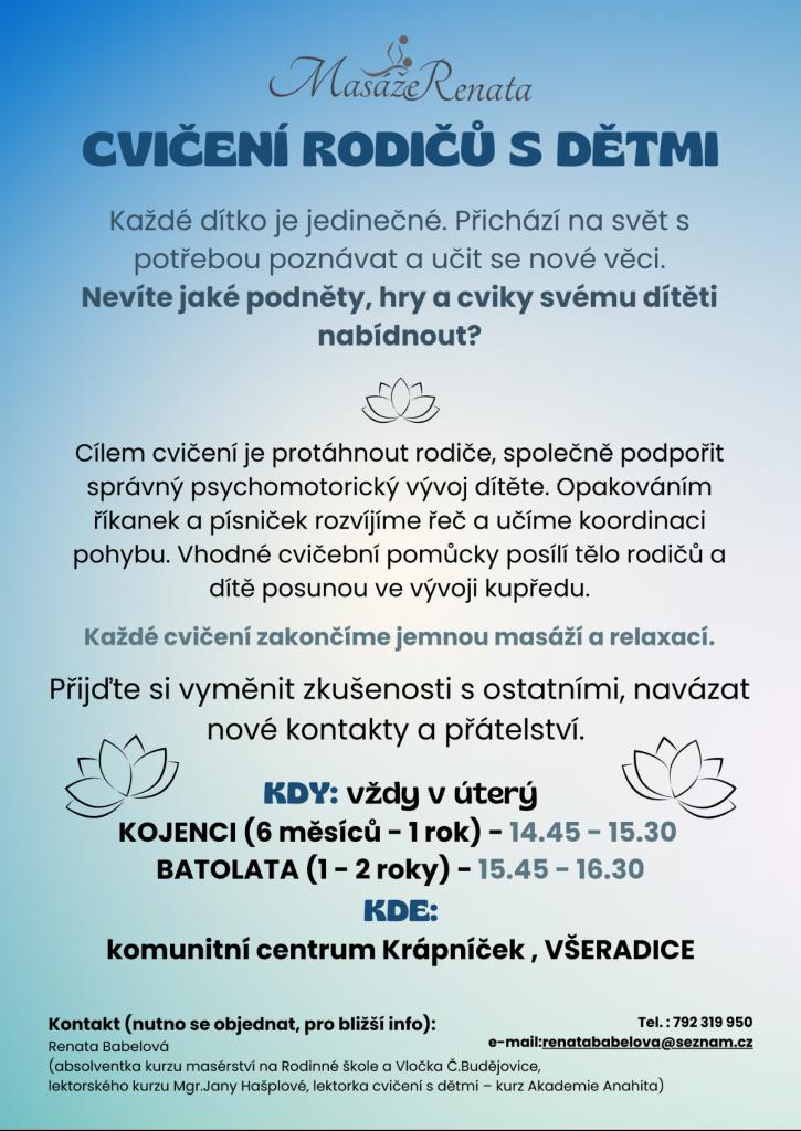 Cvičení se koná vždy v úterý pro děti od 6 měsíců do 2 let v komunitním centru Krápníček ve Všeradici. Rodiče se s dětmi zapojí do her a cvičení, které podporují správný psychomotorický vývoj. Zakončení každého cvičení zahrnuje jemnou masáž a relaxaci.