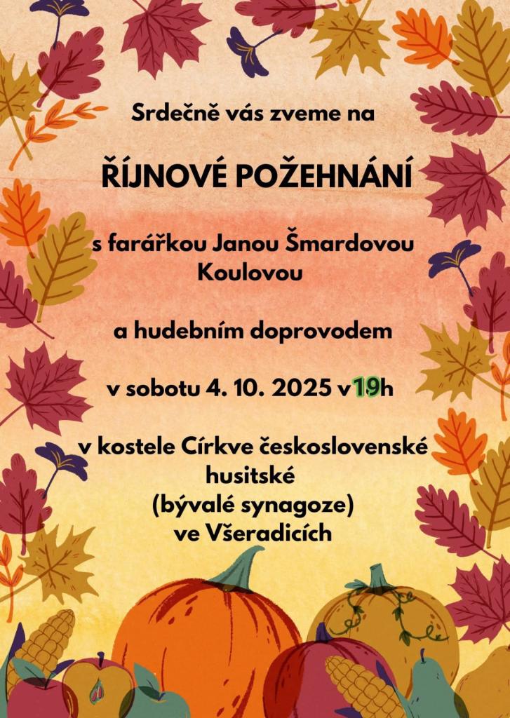 Srdečně vás zveme na Rijnové požehnání, které se uskuteční v sobotu 4. října 2025 v 19:00. Akci povede farářka Jana Šmardová a doprovodí ji hudební vystoupení. Místem konání je kostel Církve československé husitské, nacházející se v bývalé synagoze ve Všeradicích. Přijďte s námi prožít společný čas a duchovní povzbuzení.